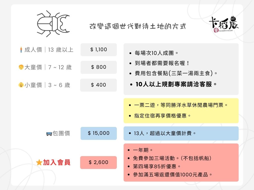 - 如因天災等不可抗力之因素取消活動,卡稻農將主動聯繫延期或退款。